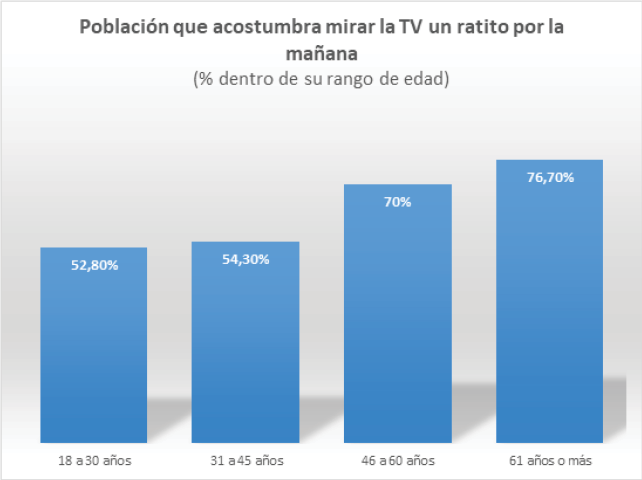 El 61.7% de los encuestados respondió que sí acostumbra mirar la televisión por las mañanas al menos un ratito; cuando se cruza esta información con los grupos de edad, se observa que a mayor edad, mayor porcentaje de población (respecto a su grupo de edad) que acostumbra mirar la televisión por las mañanas, así en el grupo de los adultos de más de 61 años que respondieron la encuesta, el 76.7% mira, al menos un ratito, la televisión por las mañanas, mientras que en el grupo de los más jóvenes (de 18 a 30 años), esta cifra se ubica en 52.8% (Figura 1).