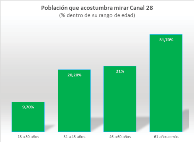 Por rango de edad, de nueva cuenta se observa que a mayor edad, mayor porcentaje de población acostumbra mirar Canal 28; de esta forma mientras únicamente el 9.7% de la población de 18 a 30 años menciona que acostumbra mirar Canal 28, en el caso de los adultos mayores de 61 años, este porcentaje se ubica en 31.7% (Figura 2).