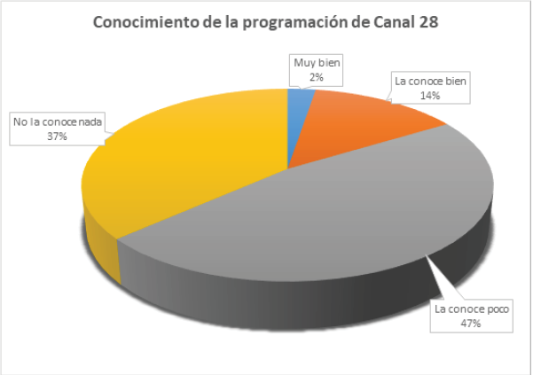A la pregunta de qué tanta probabilidad había de que elija mirar un programa de Canal 28, 9.1% contestó que muy probable y 22.5% que algo probable, mientras que 23.2% lo considero nada probable y 45.2% algo probable. El por qué 7 de cada 10 personas consideran poco o nada probable elegir mirar un programa de Canal 28, podría estar relacionado con el desconocimiento de la programación del Canal.