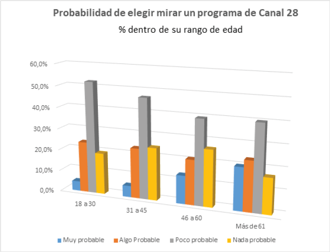 Al analizar por rango de edad, se observa que a mayor edad, mayor porcentaje de población que considera muy probable elegir mirar un programa de Canal 28, así, mientras que 20% de los adultos de más de 61 años consideran muy probable elegir mirar un programa de Canal 28, en el rango de edad de 18 a 30, este porcentaje es de 4.5%, entre los de 31 a 45 años, 5.3% y 13.2% en el rango de 46 a 60 años (Figura 5).