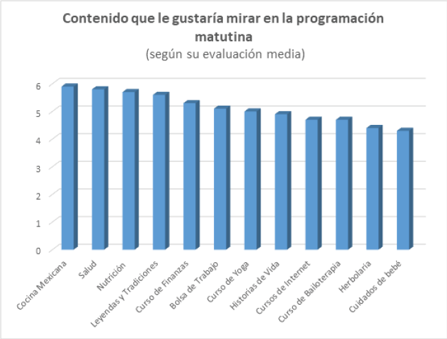 El contenido que le gustaría mirar en la programación matutina mejor evaluado, fue el relacionado con Cocina Mexicana (5.9), Salud (5.8), Nutrición (5.7), Leyendas y Tradiciones (5.6), Curso de Finanzas (5.3), Bolsa de Trabajo (5.1) y Curso de Yoga (5.0) (Figura 6).