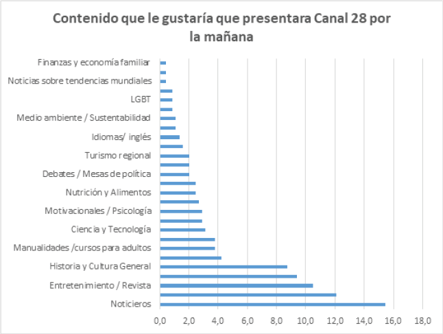 Uno de los objetivos de este estudio fue conocer el contenido que a las personas les gustaría mirar por la mañana en Canal 28, para ello se les hizo dos preguntas, en la primera pregunta se les proporcionó una lista de 12 temas y se les pidió que evaluaran (del 1 al 10) qué tanto les gustaría mirar en la programación de la televisión matutina ese contenido; la segunda, fue una pregunta abierta donde se les pedía mencionar el contenido que les gustaría que Canal 28 presentara por la mañana.