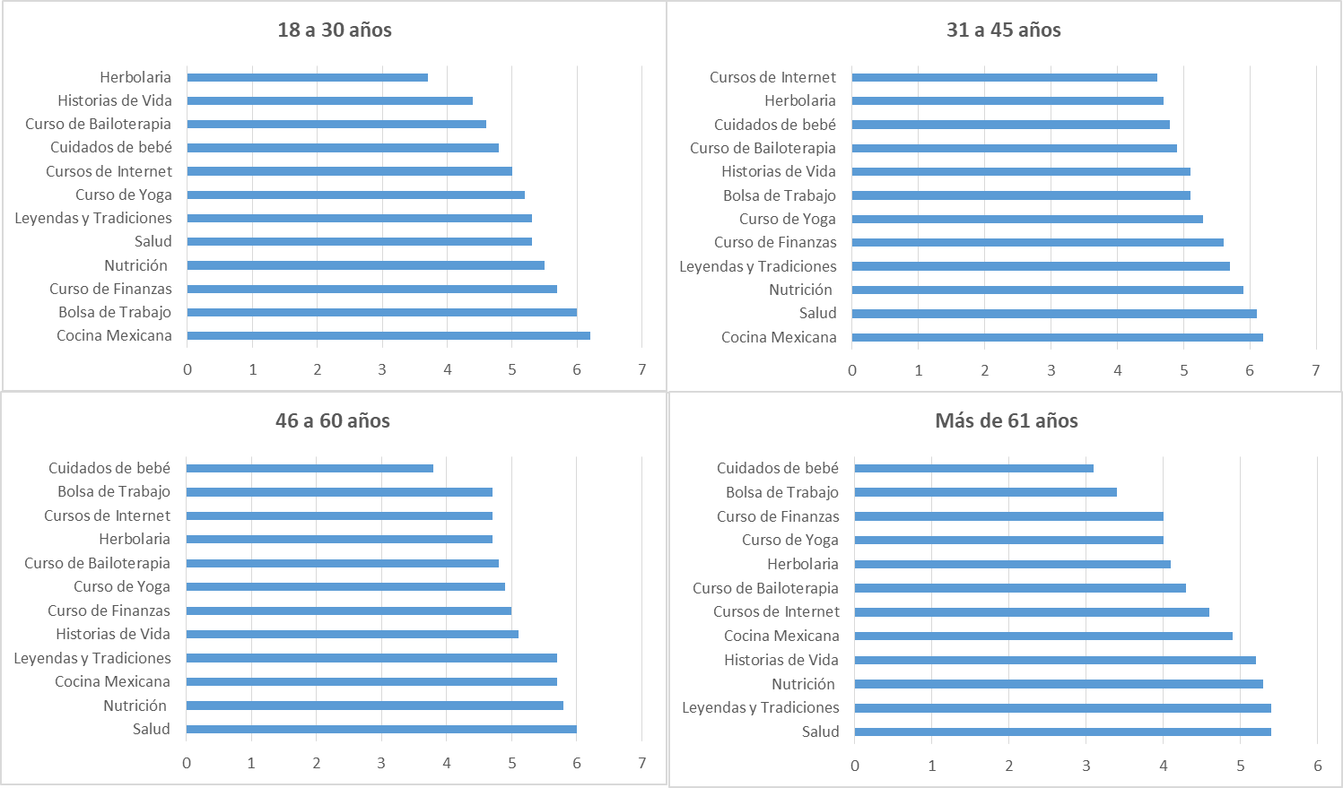 Al realizar el análisis por rango de edad, se observa que el contenido mejor evaluado por las personas de 18 a 30 años fue Cocina Mexicana (6.2), Bolsa de Trabajo (6.0) y Curso de Finanzas (5.7); para las personas de 31 a 45 años, el contenido que preferirían mirar, debido a que obtuvo la evaluación media más alta, fue Cocina Mexicana (6.2), Salud (6.1), Nutrición (5.9) y Leyendas y Tradiciones (5.7). A las personas que se encuentran en el rango de edad de 46 a 60 años les gustaría mirar contenido de Salud (6.0), Nutrición (5.8), Leyendas y Tradiciones (5.7) y Cocina Mexicana (5.7); por su parte a los adultos mayores de 61 años les gustaría mirar por la mañana contenido de Salud (5.4), Leyendas y Tradiciones (5.4), Nutrición (5.3) e Historias de Vida (5.2) (Figura 7).
