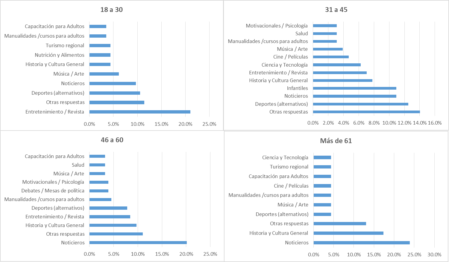 Cuando se analiza por rango de edad, se observan las preferencias específicas de cada grupo, así, al grupo de 18 a 30 años le gustaría mirar principalmente programas de Entretenimiento/Revista (21.1%), programas de Deportes alternativos (10.5%), Noticieros (9.6%) y programas de Música/Arte (6.1%). Al grupo de 31 a 45 años, los programas que les gustaría mirar por la mañana en Canal 28 serían programas de Deportes alternativos (12.5%), Noticieros (10.9%), programas infantiles (10.9%), programas de Historia y Cultura General (7.8%), programas de Entretenimiento/Revista (7%) y programas de Ciencia y Tecnología (6.3%). Las personas de 46 a 60 años, preferirían Noticieros (20.1%), programas de Historia y Cultura General (9.7%), programas de Entretenimiento/Revista (8.4%) y programas de Deportes alternativos (7.8%). Por último, el grupo de adultos mayores de 61 años, preferirían mirar principalmente Noticieros (23.9%) y programas de Historia y Cultura General (17.4%) (Figura 9).