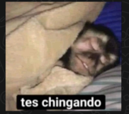 Mono acostado cubierto con una cobija en la cama descansando con expresión relajada, acompañado del texto “tes chingando” |