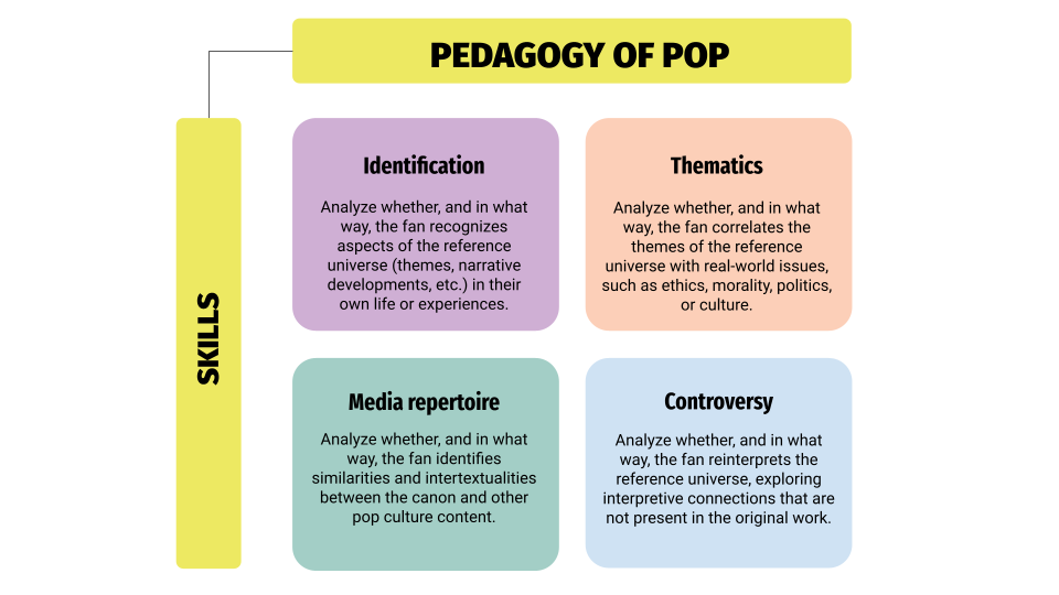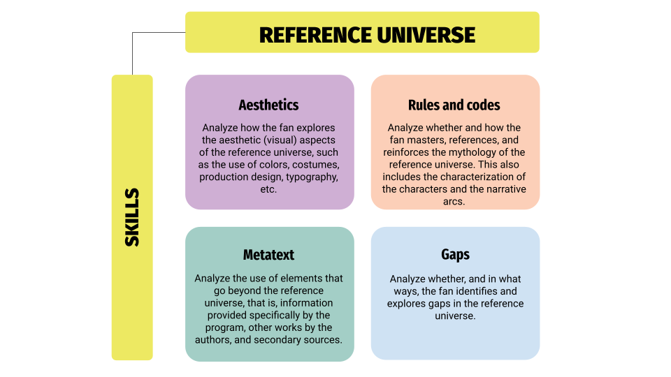 This dimension comprises four skills: (a) identification, (b) thematics, (c) media repertoire, and (d) controversy. Identification consists in assessing whether fans recognize aspects of the reference universe (themes, narrative developments, characters etc.) in their lives and/or personal experiences. The second skill, thematics, refers to how these themes are related to real-world issues such as ethics, morality, politics, and culture. The third skill investigates how fans identify similarities and intertextualities between the canon text and other pop culture content. Finally, controversy examines how fans re-signify the reference universe, exploring interpretive connections that are not present in the original work.