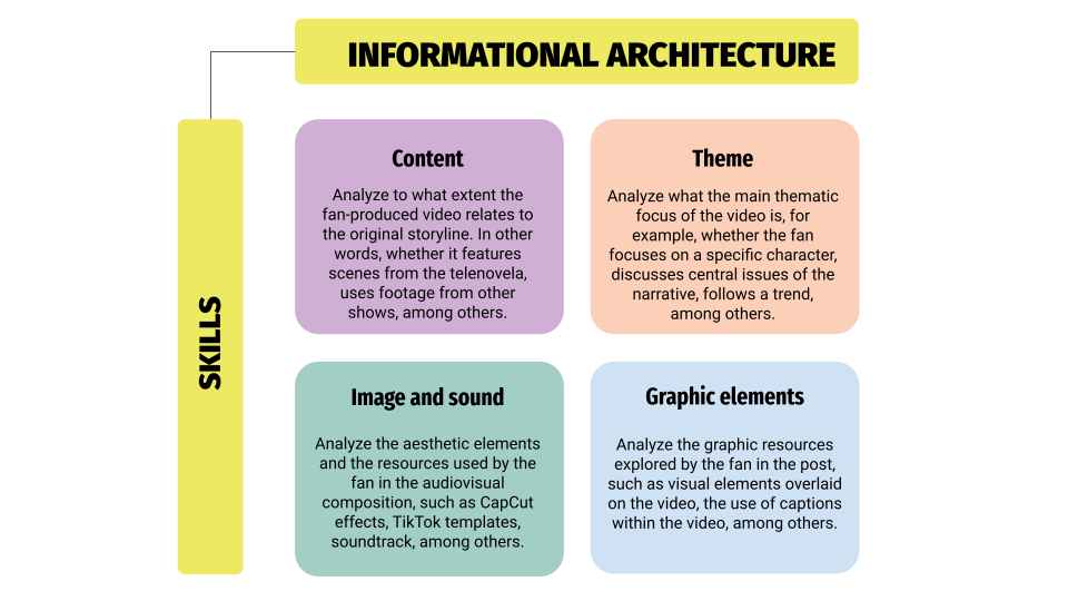 The Informational Architecture dimension is grounded in the affordances of TikTok, the chosen platform for this study. According to Abidin and Lee (2023), methodological approaches to the video social app must address not only its multimodal content but also the cultural and contextual settings of the videos. This dimension is therefore organized into four skills: (a) content, (b) theme, (c) image and sound, and (d) graphic elements.
